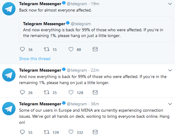 به گفته تلگرام هم اکنون این مشکل برای 99 درصد کاربران برطرف شده و 1 درصد باقی مانده باید منتظر بمانند.