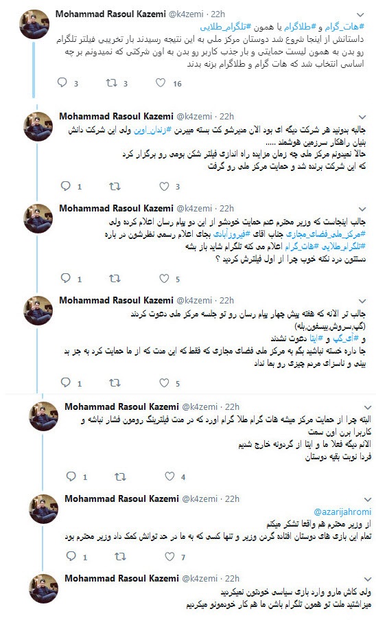 محمدرسول کاظمی در توییتر ضمن انتقاد مجدد از فعالیت هاتگرام و طلاگرام، ابراز داشت تنها کسی که در حد توانش به پیامرسانهای داخلی کمک کرده، وزیر ارتباطات است.