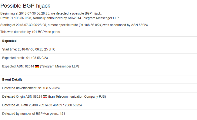 دیشب پس از قطعی 1 ساعته تلگرام اخباری مبنی بر اقدام شرکت زیرساخت برای Hijack کردن (دزدیدن) BGP تلگرام منتشر شد. به بیان دیگر، شرکت زیرساخت ایران در حال تلاش برای گمراه کردن سرویسدهندههای بینالمللی بوده تا ترافیک تلگرام را به جای هدایت به مقصد اصلی، به ایران هدایت کنند.