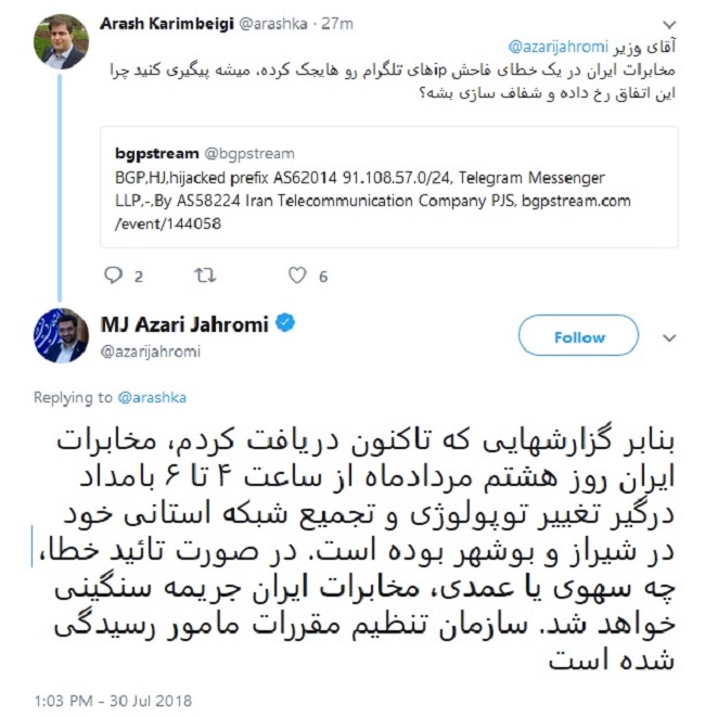 محمدجواد آذری جهرمی در پاسخ به ادعای هایجک کردن IP های تلگرام توسط مخابرات ایران در توییتر رسمی خود گفت: