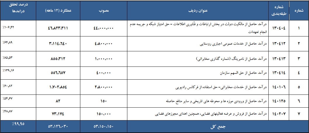 جدول زیر ردیفهای درآمدی وزارت ارتباطت و فناوری اطلاعات و دستگاههای زیر مجموعه آن را در سال 1396 نشان میدهد که موفق به تحقق 99.95 درصدی درآمدهای مصوب در بودجه همان سال شده که رقم آن 53,126,030 میلیون ریال است.