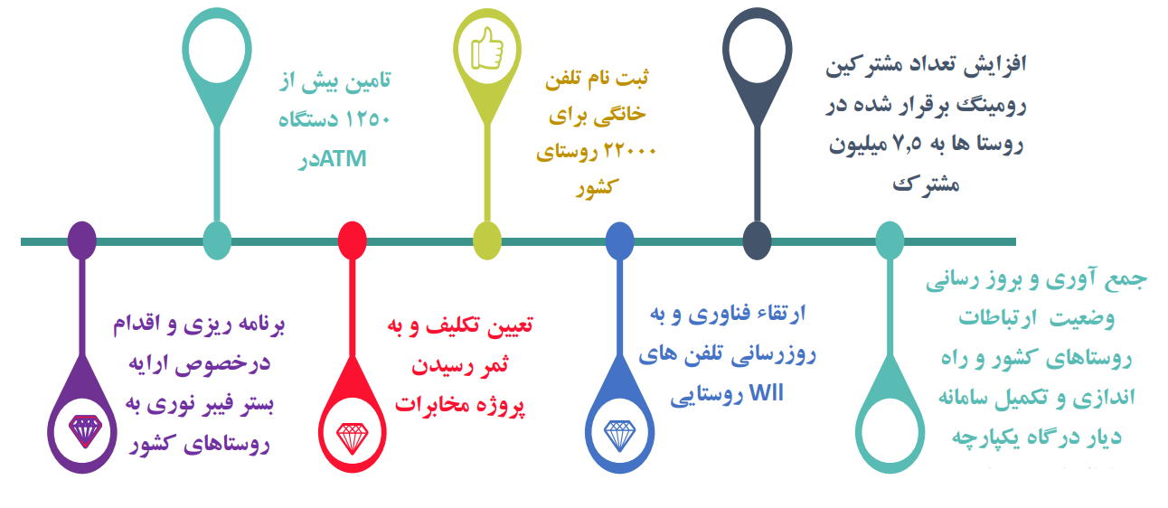همچنین وزارت ارتباطات دولت یازدهم ادعا میکند در زمینه خدمت رسانی به روستاها و مناطق محروم به موفقیتهای بزرگی دست یافته است که جدول بالا به طور خلاصه آن را نشان میدهد. از دست آوردهای این گسترش میتوان دسترسی بیش از 42 هزار روستا به شبکه سیار و دسترسی 31 هزار روستا به شبکه LTE را برشمرد. همچنین ادعا شده تعداد مشترکین رومینگ برقرار شده در روستاها به 7.5 میلیون مشترک افزایش یافته است.