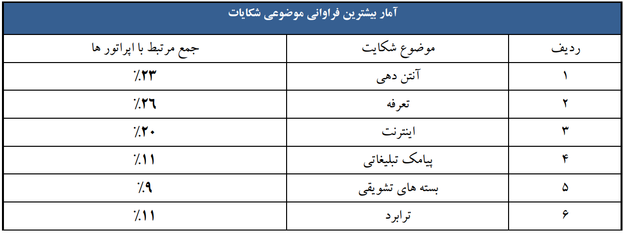 در پنج ماهه اول سال 97، در مجموع 34400 درخواست از طریق سامانه 195 صورت گرفته است که ظرف یک بازه یک ساله، میانگین سرعت پاسخگویی (به استثناء شکایات مربوط به آنتن دهی) از 8.9 روز به 3 روز کاهش یافته است. بر اساس آمار منتشر شده، نارضایتی از آنتن دهی در صدر شکایات مشترکین است. جدول زیر آمار فراوانی موضوع شکایتها را نشان میدهد: