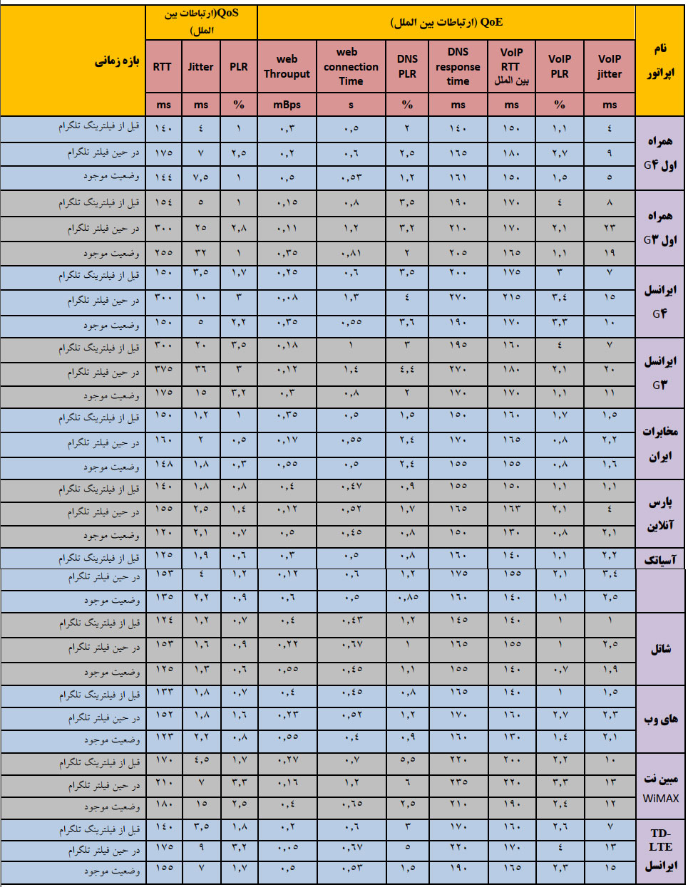 همچنین وزارت ارتباطات بر روی تلاشهای صورت گرفته در راستای کاهش تبعات منفی فیلترینگ تلگرام بر کیفیت شبکه دست گذاشته است. جدول زیر وضعیت شبکه را در هر یک از مراحل نشان میدهد: