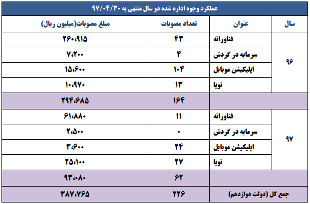 وزارت ارتباطات در کنار حمایتهایی چون رفع موانع قانونی مانند اعطای معافیتهای مالیاتی و بیمهای به کسب و کارهای نوپا، به اعطای وام از وجوه اداره شده میپردازد که گزارش آن در جدول زیر آمده است: