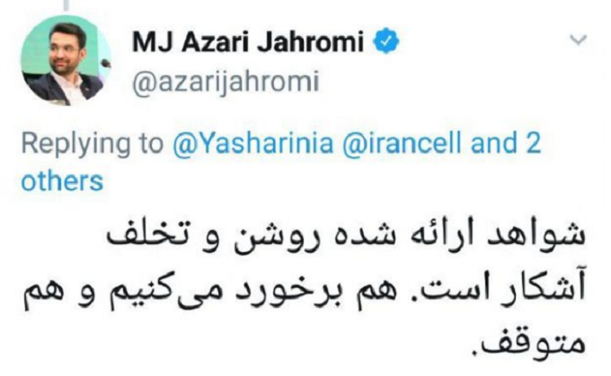 پس از توییت آذری جهرمی در خصوص این موضوع، ایرانسل درباره مشکل پیش آمده بیانیهای ارسال کرد و اعلام کرد که این موضوع را پیگیری خواهد کرد و با شرکت متخلف برخورد قاطع خواهد کرد. متن بیانیه ایرانسل در خصوص سوءاستفاده تبلیغاتی از سرویس اطلاعرسانی بحران: