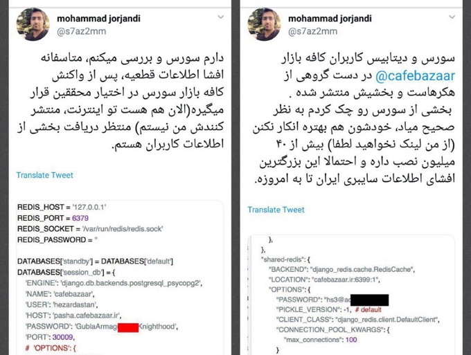 روز گذشته کاربری با نام mohammad jorjandi در شبکه اجتماعی توییتر با انتشار چند پست مدعی شده است که اطلاعات مربوط به چند میلیون کاربر برنامه بازار پس از نفوذ هکرها به منبع کد و دیتابیس اطلاعات کاربران این برنامه لو رفته است. این کاربر در توییتهای خود اعلام کرده است که منبع کد و دیتابیس کاربران کافه بازار در دست گروهی از هکرها و بخشی از آن منتشر شده است. این کاربر تاکید کرده است که بخشی از منبع را چک کرده و این موضوع واقعی به نظر میرسد. به گفته این کاربر، سرویس کافه بازا بیش از ۴۰ میلیون نصب دارد و احتمالا این بزرگترین افشای اطلاعات سایبری ایران تا به امروز است.