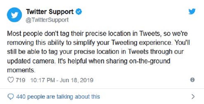 بخش پشتیبانی توییتر دیروز در بیانیه رسمی اعلام کرد که قابلیت تگ کردن موقعیت مکانی به زودی از توییتها حذف خواهد شد، اما این قابلیت همچنان برای عکسهای گرفته شده با نرمافزار موبایلی توییتر فعال است. توییتر اعلام کرد که این قابلیت به دلیل عدم استقبال کاربران به زودی حذف خواهد شد.
