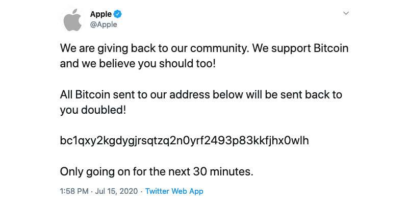 این پست در واقع توسط هکرها بر روی صفحه رسمی توییتر اپل قرار داده شده و هدف آنها سرقت بیت کوین از دنبال کنندگان صفحه توییتر شرکت اپل بوده است. خوشبختانه این پست به سرعت توسط شرکت اپل از صفحه توییتر حذف شده و دسترسی حساب کاربری را به دست آوردهاند.