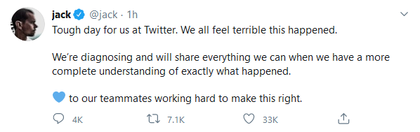 مدیر عامل توییتر جک دورسی با انتشار بیانیهای در خصوص نفوذ هکرها به زیرساختهای امنیتی این شبکه اجتماعی از تمام کاربران توییتر عذر خواهی کرده است. در حال حاضر تیم امنیتی توییتر مشغول بررسی این موضوع هستند و به همین دلیل برخی از عملکردهای حسابهای کاربری از جمله ارسال پست، بازیابی رمز عبور و پاسخ دادن به توییتها غیر فعال شده است. انتظار میرود که این محدودیت تا ساعتی دیگر از سوی تیم فنی توییتر برطرف شود.