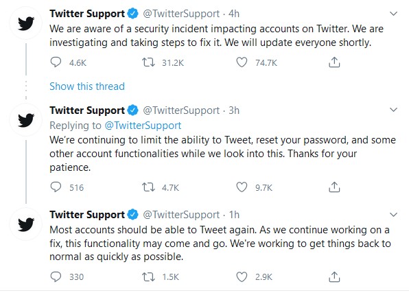 این توییتها به سرعت پاک شدند اما برخی از آنها مجدداً ارسال شدند و به نظر میرسد که کماکان هکرها به برخی از حسابهای توییتری دسترسی دارند. برخی از محققین امنیتی معتقدند که یکی از کارمندان توییتر مورد هدف هکرها قرار گرفته و در نهایت آنها به ابزارهای مدیریتی این شبکه اجتماعی دسترسی پیدا کردهاند؛ البته این خبر در حد شایعه بوده و در حال حاضر شیوه نفوذ هکرها به حسابهای توییتری مشخص نشده است.
