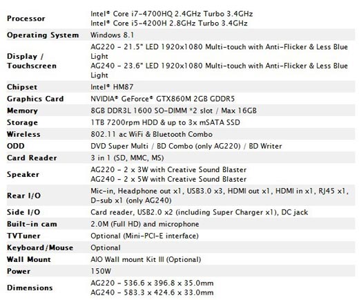 AG220 و AG240 دو محصول معرفی شده توسط msi هستند که به ترتیب دارای صفحه نمایش هایی 21.5 و 23.6 اینچی (FULL HD) می باشند. همچنین کاربر در هنگام خرید می تواند بین دو گزینه لمسی بودن و یا نبودن صفحات این دو محصول، تصمیم گیری نماید.
