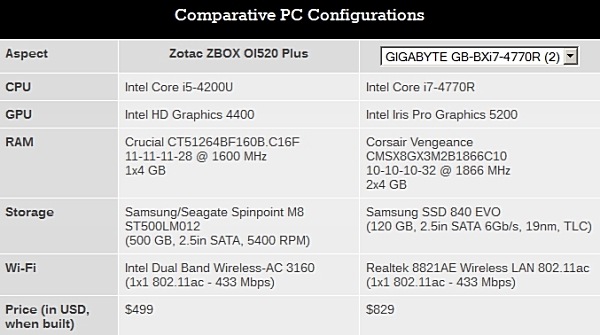 در زیر دو تصویر مقایسه ای بین ZOTAC ZBOX Sphere O1520 و Gigabyte BRIX آورده شده است. تصویر اول مقیسه بین قطعات داخلی و تصویر دوم، مقایسه Benchmark این دو Mini-PC است.
