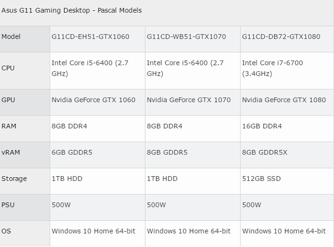 ایسوس محصولات G11 Gaming را برای اولین بار در اواسط سال 2015 معرفی کرد اما به نظر میرسد با آغاز عرضه کارت گرافیکهای GTX 10 تصمیم گرفته است این محصولات خود را هم به این کارتهای قدرتمند مجهز کند. تمامی کیسهای گیمینگ جدید G11 Gaming از پردازندههای اسکای لیک Core i5 یا Core i7 برخوردار هستند و به دلیل حضور نسل جدید از کارتهای انویدیا، ایسوس آنها را با نام Pascal Models معرفی کرده است.