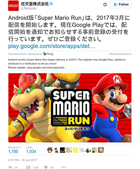 چند هفته پیش، از ایجاد صفحه رسمی این بازی در فروشگاه گوگل پلیاستور خبر دادیم. با توجه به زمان 3 ماهه از مرحله ثبتنام تا انتشار نهایی نسخه iOS این بازی نیز، انتظار عرضه نسخه اندرویدی را در سه ماه آینده در نظر داشتیم. امروز شرکت Nintendo در حساب توئیتر خود انتشار بازی Super Mario Run برای سیستم عامل اندروید در ماه مارس (اسفندماه تا اواسط فروردین سال آینده) را تائید کرد.