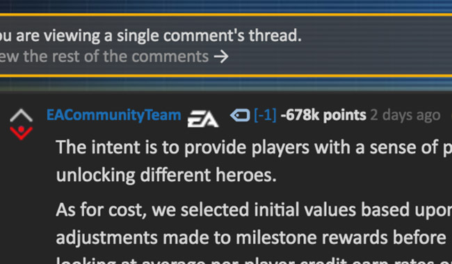 البته شرکت EA به پست این کاربر پاسخ داده و عنوان کرده است "از طریق افزایش مدت زمان آزادسازی شخصیتها، خواستهاند کاربر پس از تکمیل موارد مورد نیاز، احساس موفقیت کند" که این پست با بیشترین تعداد Downvote (معادل dislike در شبکههای اجتماعی دیگر) در تاریخ Reddit به تعداد 678,000- شده است!