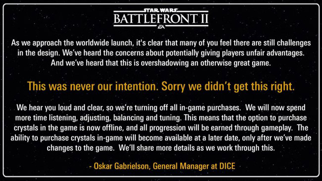 پس از چند روز بحثهای مختلف و اعتراض صاحب امتیاز بازی، Disney، استودیو تولید کننده بازی، DICE پستی را منتشر کرد که در آن اشاره میکند در پاسخ به درخواست کاربران مبنی بر ناعادلانه بودن روند بازی از طریق هزینه پول واقعی در آن، تمامی آیتمهای قابل خرید در بازی به طور موقت غیرفعال خواهند شد تا روندی جاگزین برای این مشکل پیدا کنند. در همین زمان بازی Need for Speed: Payback هم بی نسیب نمانده و یک Patch برای تغییر سیستم بازی از طریق سرعت بخشیدن به روند بازی به جای هزینه پول واقعی در آن ارائه شده است.