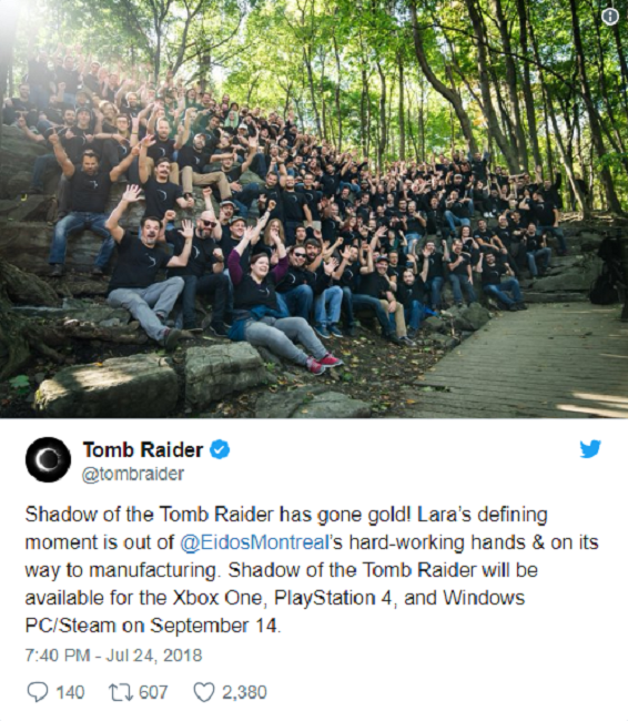 بازی Shadow of The Tomb Raider گلد شد، کار ساخت این عنوان در استودیو Eidos Mountreal به اتمام رسیده و مراحل تولید نسخه های مختلف را برای آماده شدن در روز عرضه طی میکند. بازی Shadow of the Tomb Raider در تاریخ جمعه، ۲۳ شهریور برای پلیاستیشن ۴، اکسباکس وان و رایانههای شخصی منتشر میشود.