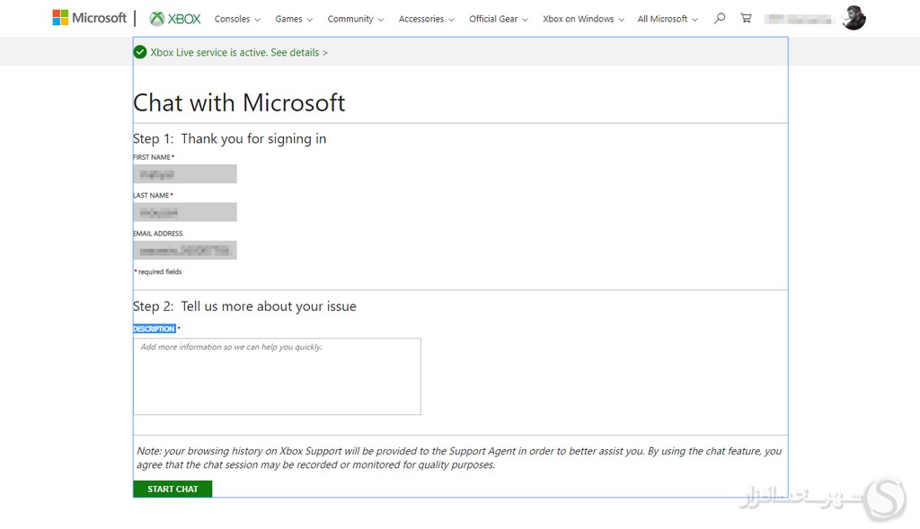 به گفته پشتیبان مایکروسافت، کاربران برای این موضوع باید با پشتیبانی بخش اکانت های ایکس باکس لایو از طریق این لینک تماس بگیرند. توصیه میکنیم پیش از ورود به این لینک، IP خود را به کشوری که اکانت لایو را بر مبنای آن ساختهاید تغییر دهید. پس از ورود به لینک باید نام کاربری و سپس رمز عبور خود را وارد کنید. سپس به صفحه ارتباط با پشتیبانی اکانتها هدایت میشوید. در این بخش در کادر DESCRIPTION متن کوتاهی از مشکل خود را به زبان انگلیسی بنویسید و سپس دکمه Start Chat را فشار دهید.