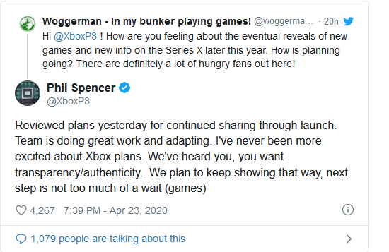 این کاربر توییتری با انتشار پستی در حساب شخصی خود از فیل اسپنسر در خصوص برنامههای مایکروسافت برای معرفی نهایی کنسول گیمینگ ایکس باک سری ایکس و بازیهای آن سوال پرسید. در نهایت فیل اسپنسر به توییت این شخص جواب داده و اعلام کرد که هیچوقت تا این حد از برنامهریزیهای تیم ایکس باکس برای معرفی نسل جدید کنسول گیمینگ هیجان زده نبودم. تیم ما درخواست شما را درک میکند، کاربران به دنبال شفافیت هستند.