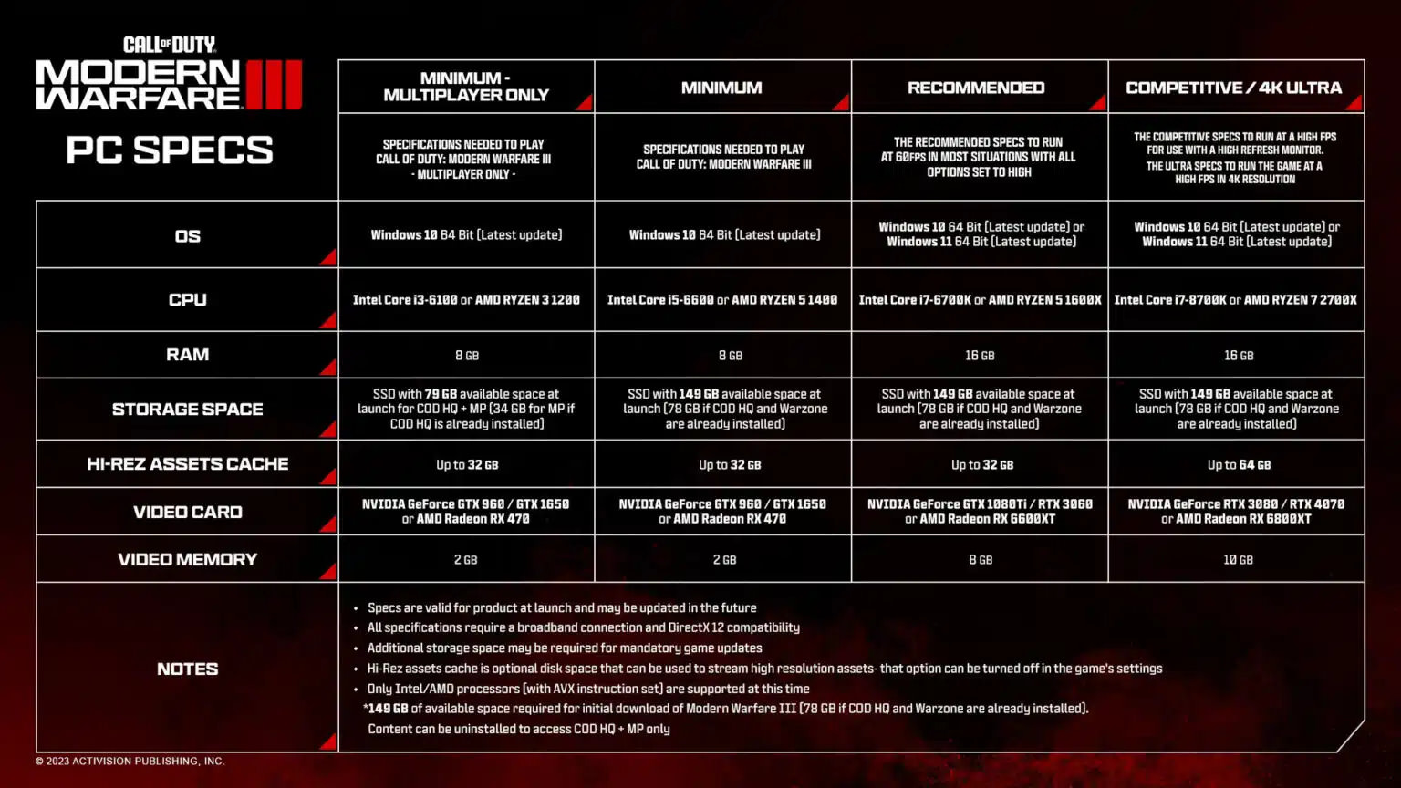 به گزارش Hardwaretimes، برخلاف نسخههای پیشین کال آف دیوتی و عضو بتل رویال این خانواده یعنی Warzone، به نظر میرسد که شاهد یک بازی بسیار بهینه شده خواهیم بود چرا که برای اجرای Call of Duty: Modern Warfare 3 در پایینترین سطح گرافیک و رزولوشن 1080p تنها به یک پردازنده Core i5-6600 اینتل یا Ryzen 5 1400 در کنار کارت گرافیک GeForce GTX 960 یا Radeon RX 470 و 8 گیگابایت حافظه رم نیاز خواهید داشت.