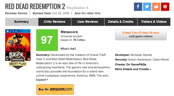 بالاخره پس از انتظار فراوان، نمرات بازی محبوب Red Dead Redemption 2 منتشر شد. این بازی موفق شد تا با تعداد 76 نقد، میانگین نمرات 97 از 100 را دریافت کند؛ اکثر سایتهای مرجع و معروف گیمینگ نمره 10 از 10 را برای این بازی افسانهای در نظر گرفتهاند.