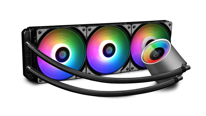 همراه با این کولر سه عدد فن 120 میلی متری مجهز به نورپردازی RGB LED قابل شخصی سازی و بالشتکهای نرم لاستیکی ارائه میشود. سرعت چرخش این فنها بین 500 تا 1,800 دور در دقیقه قابل تنظیم است و حداکثر قادر به جابجایی حجم هوا 69.34CFM هستند. به ادعای دیپکول حداکثر آلودگی صوتی این فنها به 30dBA میرسد.