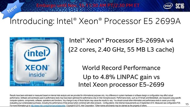 اینتل همچنین در مراسم معرفی این تراشه اعلام کرد با تغییراتی که در فناوری لیتوگرافی 14 نانومتری ایجاد کرده است توانسته عملکرد این تراشه را نسبت به محصول مشابه پیشین به میزان قابل قبولی بهبود ببخشد. بنچمارک LINPACK نشان میدهد که عملکرد تراشه E5-2699A v4 نسبت به عملکرد تراشه E5-2699 v4 در حدود 4.8 درصد بهتر است.
