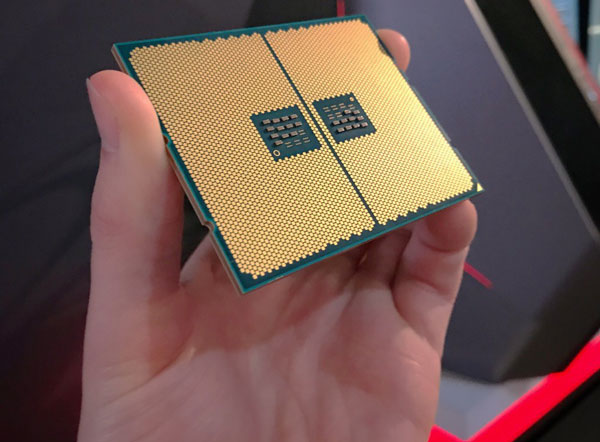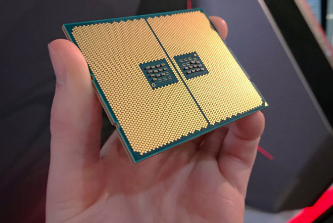 از آنجایی که با یک تراشه MCM ساخته شده از اتصال دو تراشه مجزا روبرو هستیم، به وضوح محل تلاقی آنها با یکدیگر قابل رویت است و پین های هر تراشه را جدا می کند. همچنین قطعات SMD ضروری هر تراشه به طور جداگانه تعبیه شده اند. در تراشه های Ryzen فعلی خبری از قطعات SMD بیرونی نیست و همه اجزا آن در سمت دیگر برد تعبیه شده اند.