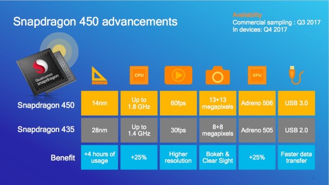کوالکام بهطور رسمی از پلتفرم موبایل اسنپ دراگون ۴۵۰ در کنگره جهانی موبایل ۲۰۱۷ شانگهای رونمایی کرد. پردازنده جدید کوالکام که بهطور ویژه برای گوشیهای هوشمند با قیمت پایین درنظر گرفته شده، بهبود کارایی و بهینهسازی مصرف باتری را در مقایسه با چیپست اسنپدراگون ۴۳۵ به همراه خواهد داشت.