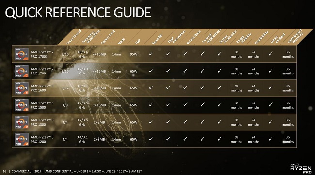 اما پردازنده Ryzen 5 Pro 1600 دقیقاً دارای مشخصات و ویژگیهای پردازنده Pro 1700 است و پردازنده دیگر Ryzen 5 Pro 1500 دقیقاً یک نسخه کپی از پردازنده دسکتاپ 1500X است که قرار است با نام دیگر و چند ویژگی جدید روانه بازار شود. پردازندههای Ryzen 3 PRO نیز قرار است دارای چهار هسته و چهار رشته پردازشی باشند اما AMD تاکنون جزییات بیشتری از آنها منتشر نکرده است. انتظار میرود این محصولات به گونهای طراحی شده باشند که با قیمت پایینتری نسبت به محصولات پیشین روانه بازار شوند. گفته میشود ویژگی پردازندههای Ryzen 3 PRO درست مشابه به نسخه دسکتاپ آنها که چندی پیش روانه بازار شد انتخاب شده است. جدول زیر مشخصات کاملی از این خانواده از محصولات AMD را نشان میدهد.