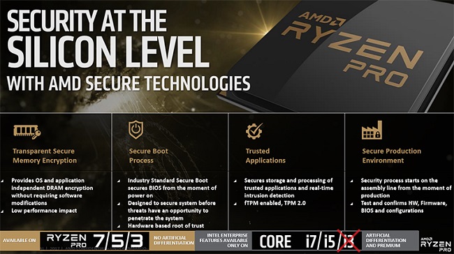 اما AMD سعی کرده است با افزودن چندین قابلیت و ویژگی جدید، کاربران را به جای خرید پردازندههای معمولی رایزن به سمت پردازندههای رایزن پرو سوق دهد. یکی از این ویژگیهای مهم امنیت بهتر و ارتقا یافته است. AMD اعلام کرده است که با استفاده از فناوریهای جدید در بخش امنیت و همچنین پشتیبانی کامل از راهکارهای امنیتی موجود در نسخه Enterprise از ویندوز 10 قادر است در پردازندههای رایزن پرو، حریم امن بسیار گستردهای را برای کاربران فراهم آورد. علاوه بر این، پردازندههای Ryzen PRO از سیستم رمزگذاری حافظه پیشرفته موجود در پردازندههای Epyc 7000 که چندی پیش از سوی AMD معرفی شدند نیز بهره میبرند. کمپانی سازنده همچنین به کاربران خود اطمینان داده است که در مراحل تولید این تراشهها از قطعات سخت افزاری مطمئن و با کیفیت استفاده کرده است تا کمترین میزان خطر ریسک در ایجاد نقص و مشکل برای آنها ایجاد شود.