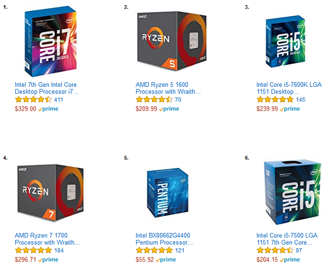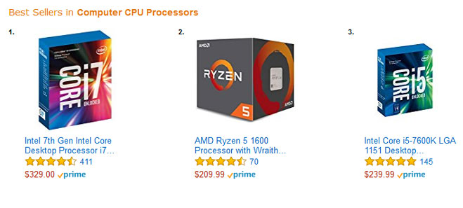 پردازنده AMD Ryzen 5 1600 به جایگاه دوم لیست پرفروشترین پردازندههای فروشگاه آمازون دست یافت و پردازنده Core i5-7600K اینتل را پشت سر گذاشت. هرچند که لیست پرفروش ترینهای آمازون لزوماً سهم محصول از بازار را بازتاب نمیدهد، اما راه یافتن یک محصول به آن نشان از جذابیت آن برای خریداران است.