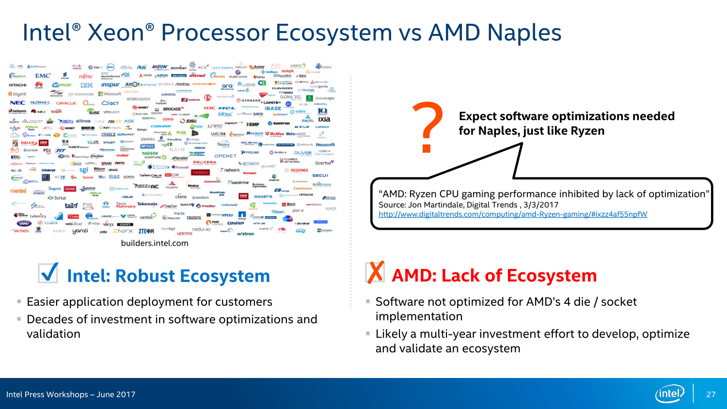 اینتل در ارائه رسمی خود برای معرفی جدیدترین پردازندههای سرور Xeon، بر نبود بهینه سازی برای پردازندههای سرور AMD دست گذاشته و مدعی شده باعث میشود کارایی آنها با پردازندههای این کمپانی قابل مقایسه نباشد. اینتل ادعا کرده پردازندههای AMD توسط هیچ توسعه دهندهای با بهینه سازیهای اختصاصی حمایت نمیشوند.