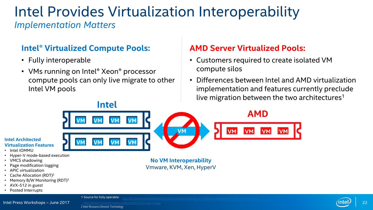 اینتل از پشتیبانی نکردن پردازندههای AMD از پلتفرمهای مجازی سازی رایج به عنوان یک ضعف دیگر رقیب نام برده است.