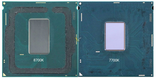 درست همانطور که در تصویر بالا مشاهده میکنید، پهنای پکیج قطعه سیلیکونی 8700K با 7700K یکسان است اما طول آن قدری افزایش یافته که ناشی از افزایش تعداد هستههای پردازشی از 4 به 6 هسته است.