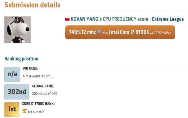 پردازنده 6 هستهای Core i7-8700K اینتل از راه نرسیده به 7.4 گیگاهرتز اورکلاک شد. این رکورد تحت خنک سازی با نیتروژن مایع در دمای زیر صفر درجه به دست آمده و در حال حاضر رکورد 8700K شماره 1 دنیا با 100 درصد افزایش فرکانس نسبت به فرکانس اصلی است.
