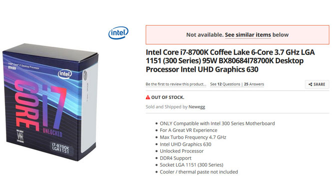 اگر سری به فروشگاههای آنلاین بزرگ چون Newegg بزنید، برخی پردازندههای Coffee Lake در اغلب آنها ناموجود شدهاند و با فاصله تحویل چند هفتهای پیش فروش میشوند. هم اکنون Core i7 8700K در فروشگاه Newegg ناموجود شده و تاریخ تحویل تقریبی بین 15 الی 20 روز ذکر شده است. Newegg تأیید کرده این فروشگاه بیش از 3000 عدد پردازنده Core i7 8700K سفارش داده که انتظار میرود طی 3 الی 5 هفته به دست آنها برسد.