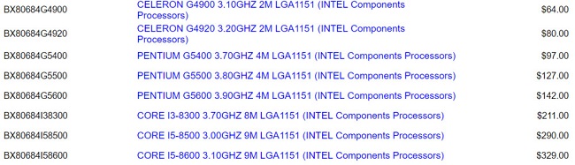 اطلاعات مورد بحث که از در برخی فروشگاهها رویت شدهاند، حاکی از عرضه پردازنده دو هستهای Celeron G4900 (دو Thread) با قیمت 51 دلار، Core i5-8600 چهار هستهای (هشت Thread) با قیمت 264 دلار، Pentium G5600 دو هستهای (چهار Thread) با قیمت 77 دلار، i3-8300 چهار هستهای (چهار Thread) با قیمت حدود 165 دلار و i5-8500 شش هستهای (شش Thread) با قیمت 228 دلار است.