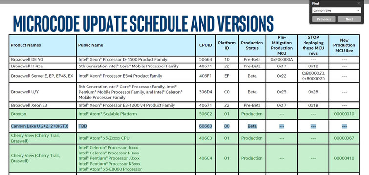یک سند منتشرشده از اینتل که مربوط به راهنمای به روز رسانی میکرو کد به منظور برطرف کردن آسیب پذیری Spectre است و تاریخ آن به 8 فوریه باز میگردد، وجود مدلهای دو هستهای Cannon Lake را تأیید میکند. این سند دو مدل پردازنده 10 نانومتری Cannon Lake با پسوند U را نشان میدهد. معمولاً پسوند U نشان از مدلهای بسیار کم مصرف مخصوص استفاده در دستگاههای قابلحمل چون نوت بوک ها است و از زمان نسل پنجم پردازندههای Core این کمپانی تاکنون توان طراحی گرمایی آنها 15 وات است. نکته جالبی که این سند نشان میدهد، وجود یک مدل بدون پردازنده گرافیکی مجتمع در کنار دست کم یک مدل مجهز به آن است. 2+2 نشان از وجود دو هسته پردازشی مرکزی در کنار پردازنده گرافیکی مجتمع GT2 است اما “2+0(GT0)” به نداشتن پردازنده گرافیکی مجتمع اشاره دارد.