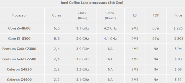 طبق این لیست Celeron G4900 و Celeron G4920 به ترتیب با قیمت 51 و 63 دلار،Pentium Gold G5400 و G5600 به ترتیب با قیمت 83 و 94 دلار، Core i3-8300 با قیمت 135 دلار و Core i5-8500 و Core i5-8600 با قیمتهای 225 و 257 دلار عرضه میشوند.