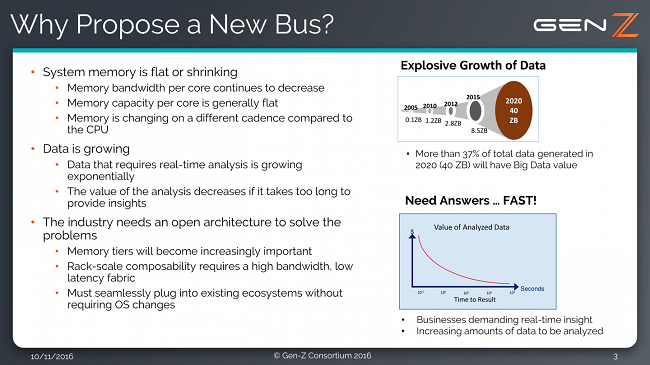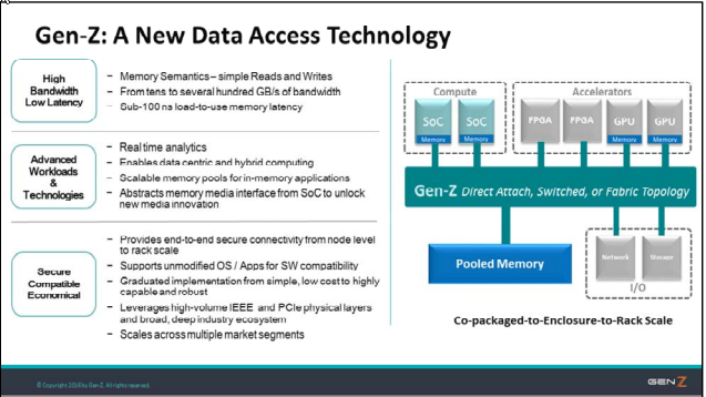 تقریباً همانند رابط PCIe،اGen-Z نیز یک مسیر- رابط ارتباطی است که به اجزای مختلف کامپیوتر امکان ارتباط با همدیگر از طریق یک گذرگاه داده را میدهد، برای نمونه پردازنده گرافیکی یا SSD های پرسرعت میتوانند از طریق Gen-Z با پردازنده اصلی یا چیپ ست ارتباط برقرار کنند. علی رغم اینکه همین حالا نسخه 4.0 از استاندارد PCIe تدوین شده و پهنای باند دو برابری نسبت به نسخه 3.0 ارائه میکند، اما از نگاه کنسرسیوم پشت Gen-Z، سرعت توسعه PCIe با پیشرفت فناوری هم خوانی ندارد و نمیتواند نیرو بخش فناوریهای آینده باشد. احتمالاً نیاز برای یک استاندارد پرسرعتتر با ظهور فناوریهایی چون هوش مصنوعی و محاسبات با کارایی بالا بی ارتباط نباشد.