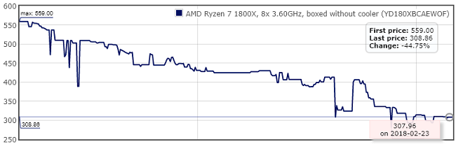 نمودار بالا قیمت Ryzen 7 1800X درگذر زمان را نشان میدهد که اکنون در کشورهای اروپایی به 310 یورو رسیده است. بررسیهای بیشتر نشان میدهد تقریباً تمامی مدلهای فعلی Ryzen مشمول کاهش قیمت شدهاند و حالا از هر زمان دیگری ارزانتر هستند. احتمال داده میشود این کاهش قیمت به دیگر مناطق نیز گسترش یابد و طرح AMD برای خلاص شدن دست موجودی فعلی باشد.