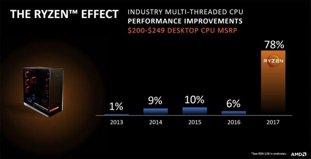در طول سال 2017، این شرکت سهم خود از بازار پردازندههای دسکتاپ را به میزان 50 درصد نسبت به سال گذشته افزایش داده است و در سه ماههی ابتدایی سال 2018، AMD شاهد این بود که 50 درصد درآمد فروش پردازندههای خود ناشی از فروش رایزن است که رشد 40 درصدی نسبت به سه ماههی آخر 2017 داشته است.