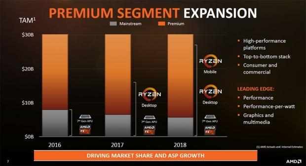 AMD انتظار عرضهی 60 پلتفرم جدید بر پایهی Ryzen در سال 2018 از سوی OEMهای مختلف را دارد که یک بازار 10 میلیارد دلاری را در بخش موبایل برای این شرکت به ارمغان خواهد آورد که افزون بر بازار 9 میلیارد دلاری این شرکت در بازار CPUها خواهد بود.