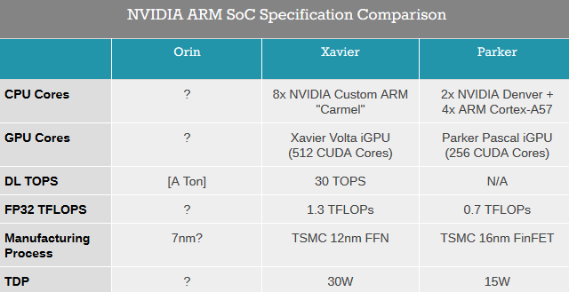 علیرغم اینکه هم اکنون انویدیا در حال ارائه نمونههایی از Xavier به شرکای خود است، این کمپانی از همین حالا به دنبال توسعه نسل بعدی SoC های خود است که ظاهراً کُد Orin را یدک خواهند کشید. برخلاف Xavier که از همان سال 2016 اطلاعات آن منتشر شد، انویدیا چیز زیادی درباره Orin نگفته و فقط می دانیم نسل بعدی SoC های انویدیا است.