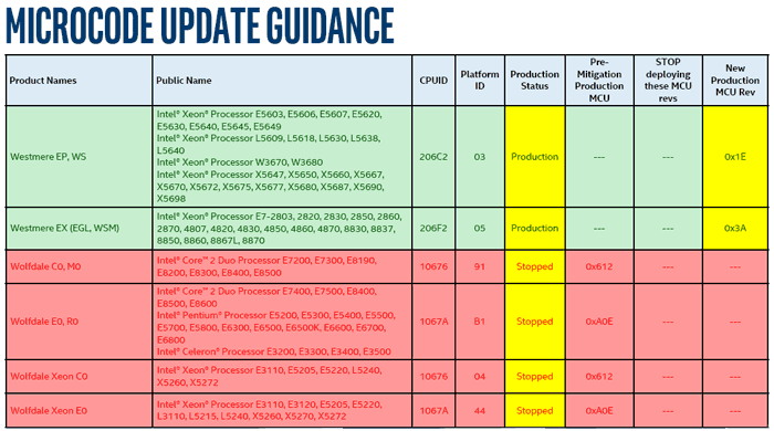 به عبارتی دیگر اینتل میگوید با بررسی بیشتر به این نتیجه رسیدهاند که دلایل زیادی برای عرضه وصله امنیتی برای این پردازندهها وجود ندارد. ادعا شده بسیاری از سیستمهای مجهز به این پردازندهها به اینترنت متصل نیستند و در عمل نیز امکان انتشار وصله امنیتی وجود ندارد، چراکه دیگر سازندگان از این محصولات پشتیبانی نمیکنند و سالها است کنار گذاشته شدهاند. سری Core 2 جزو پردازندههایی هستند که وصلههای مورد بحث را دریافت نخواهند کرد.