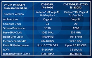 طبق معرفی رسمی، میبایست پردازنده های Kaby Lake-G در بخش گرافیک دارای پردازنده گرافیکی مبتنی بر ریزمعماری VEGA باشند اما بسیاری برنامهها آن را به عنوان Polaris میشناسند که شبهه برانگیز است. اخیراً وب سایت Tom's Hardware به بررسی این موضوع پرداخته است و متوجه شده برخی از قابلیتها و فناوریهای موجود در پردازندههای گرافیکی مجزا VEGA در پردازندههای Kaby Lake-G وجود ندارد. یکی از این قابلیتها Rapid Packed Math است که توسط برخی بازیها چون Far Cry 5 و Wolfenstein 2: The New Colossus پشتیبانی میشود.