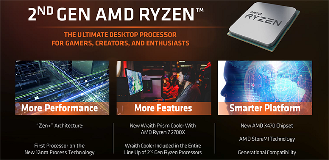 دومین نسل از پردازندههای Ryzen قادر هستند نسبت به محصولات عرضه شده در نسل قبل سرعت عملکرد بالاتری را فراهم آورند. همچون نسل قبل از این محصولات، پردازندههای عرضه شده در قالب محصولات Ryzen 7 دارای هشت هسته و 16 رشته پردازشی هستند. استفاده از هستههای ارتقا یافته Zen+ در این محصولات سبب شده است که پردازنده Ryzen 7 2700X قادر باشد در حداکثر توان خود سرعت 3.4 گیگاهرتز را فراهم آورد.