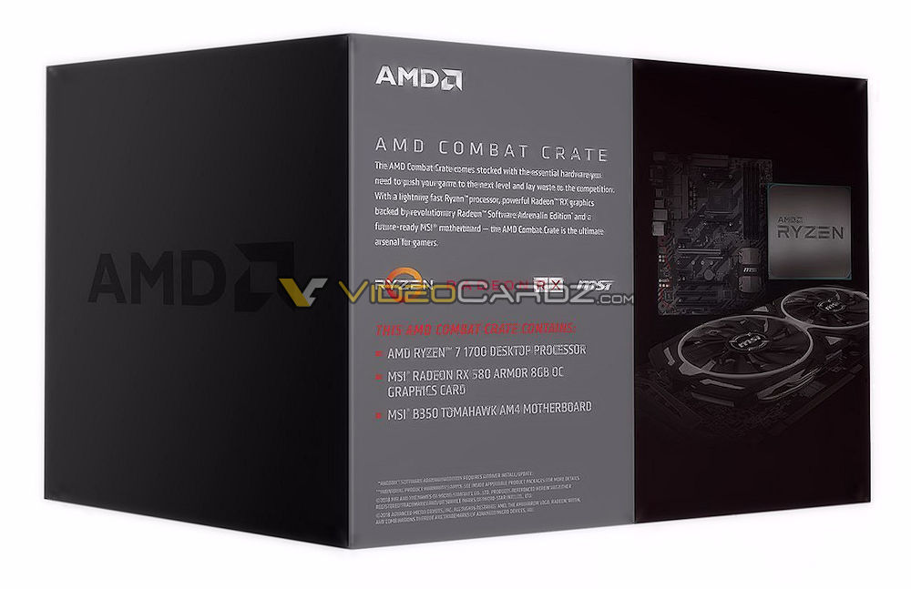 AMD در توضیحات این باندل نوشتهاست: «Combat Crate حاوی سختافزار مورد نیاز برای گیمینگ سطح بالا است. این باندل که حاوی پردازندهی سریع رایزن، به همراه گرافیک قدرتمند RX و مادربرد با امکانات فراوان از MSI است یک زرادخانهی گیمینگ محسوب میشود.»